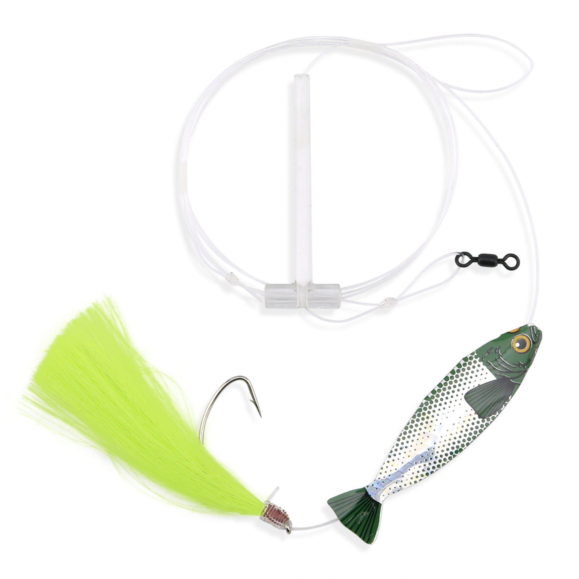 Aqua-Clear, Hair Teaser Rig, Flounder/Fluke/Sea Trout/Weakfish/Croaker, 3/0 Nickel Wide Gap Hook, AFW Swivel, 40 lb/18.1 kg GS Mono, T-Standoff, Chrtrse Hair, GreenHolo MinnowAvailability: In stock