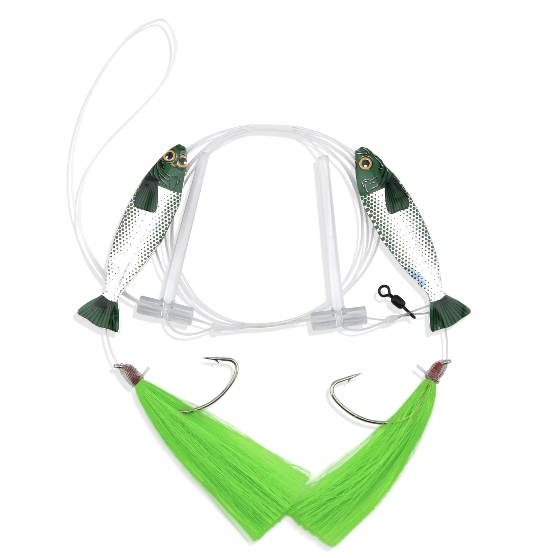 Aqua-Clear, Hi-Lo Hair Teaser Rig, Flounder/Fluke/SeaTrout/Croaker, 3/0 Nickel Wide Gap Hook, 40 lb / 18.1 kg GS Mono, T-Standoff, Green Hair, Green Holographic MinnowAvailability: In stock