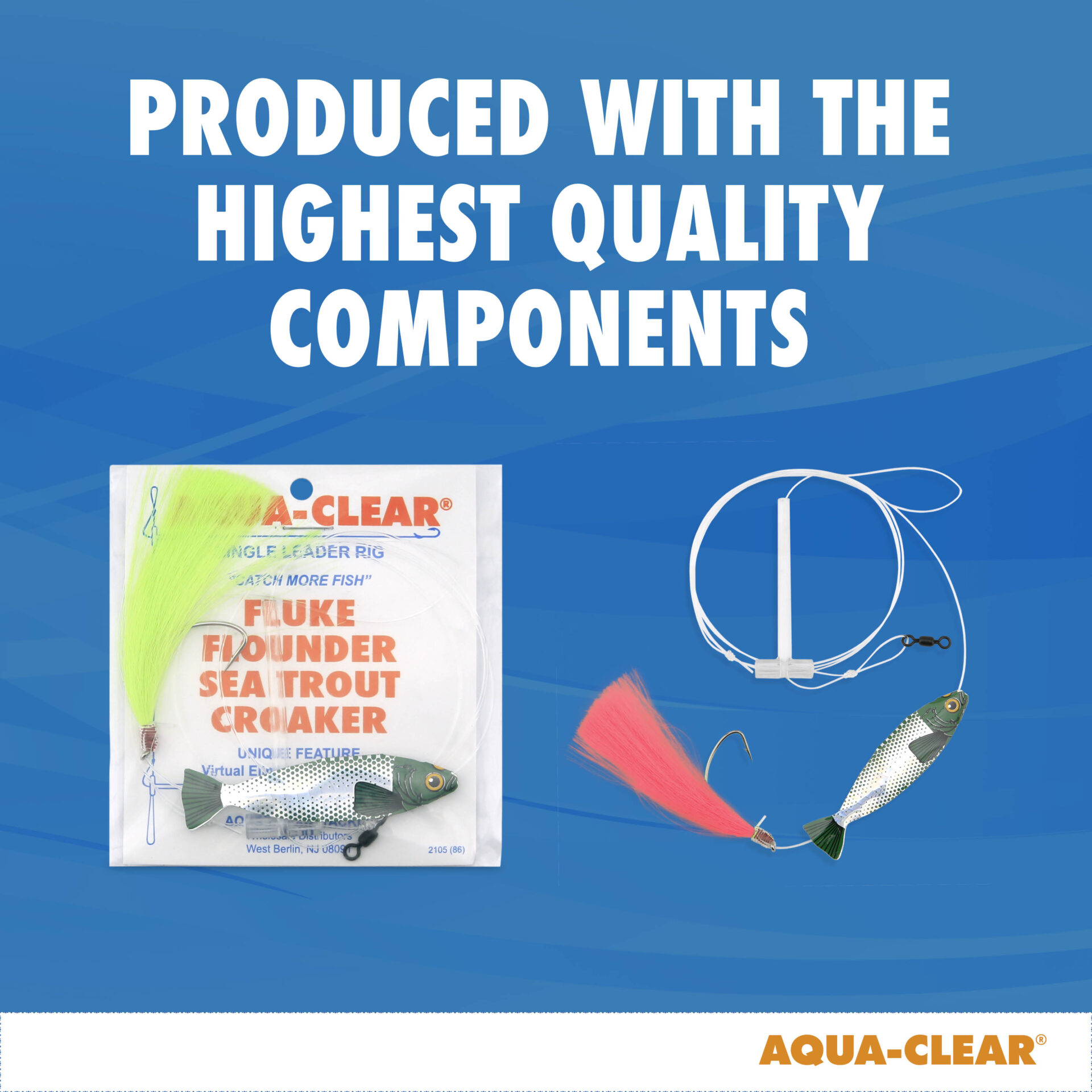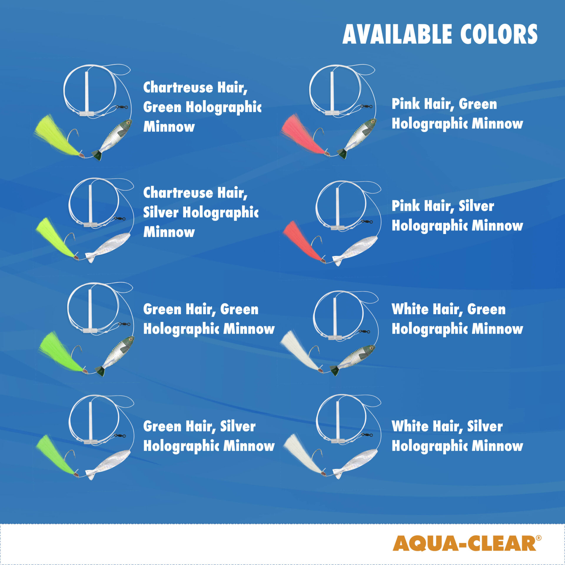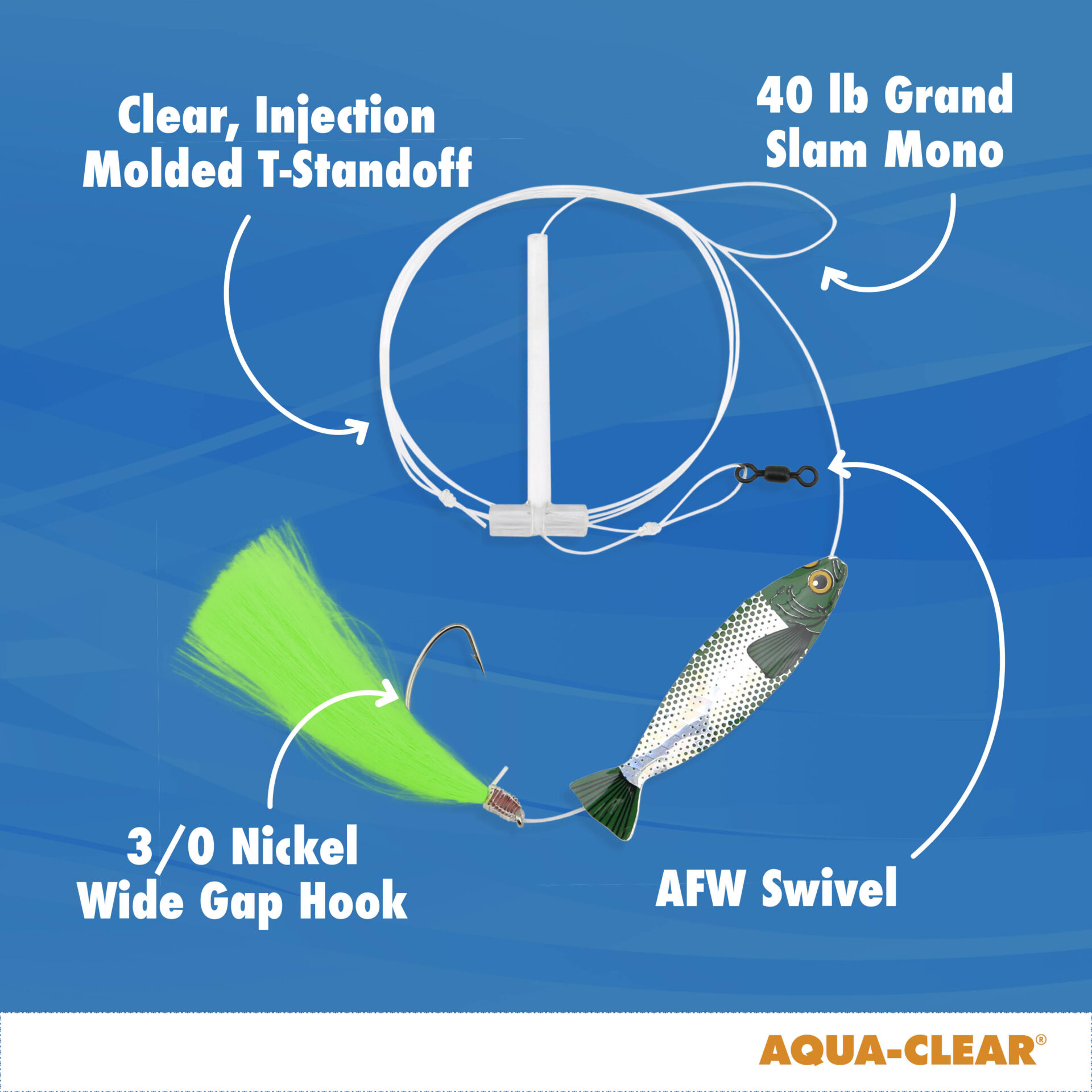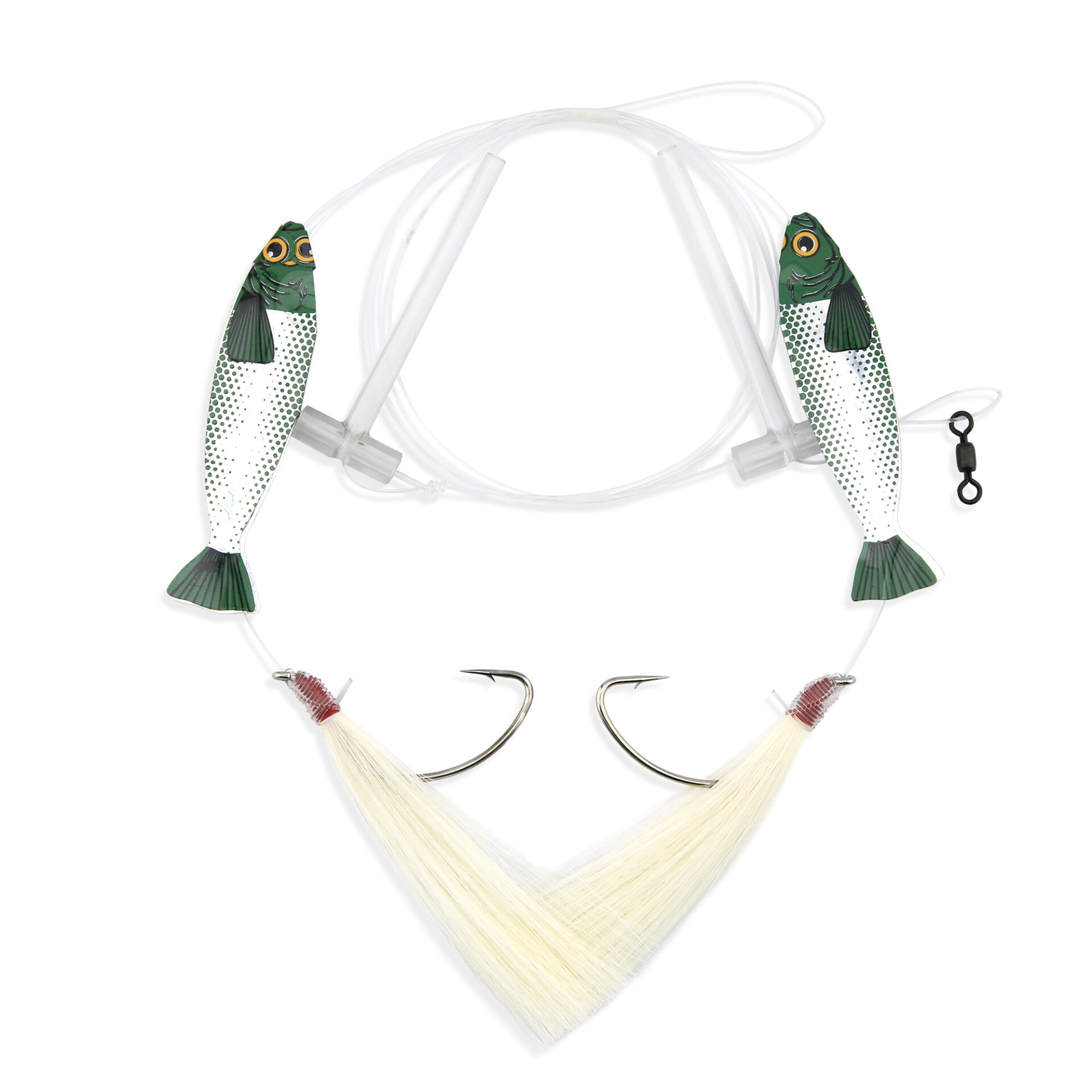 Aqua-Clear, Hi-Lo Hair Teaser Rig, Flounder/Fluke/SeaTrout/Croaker, 3/0 Nickel Wide Gap Hook, 40 lb / 18.1 kg GS Mono, T-Standoff, White Hair, Green Holographic MinnowAvailability: In stock