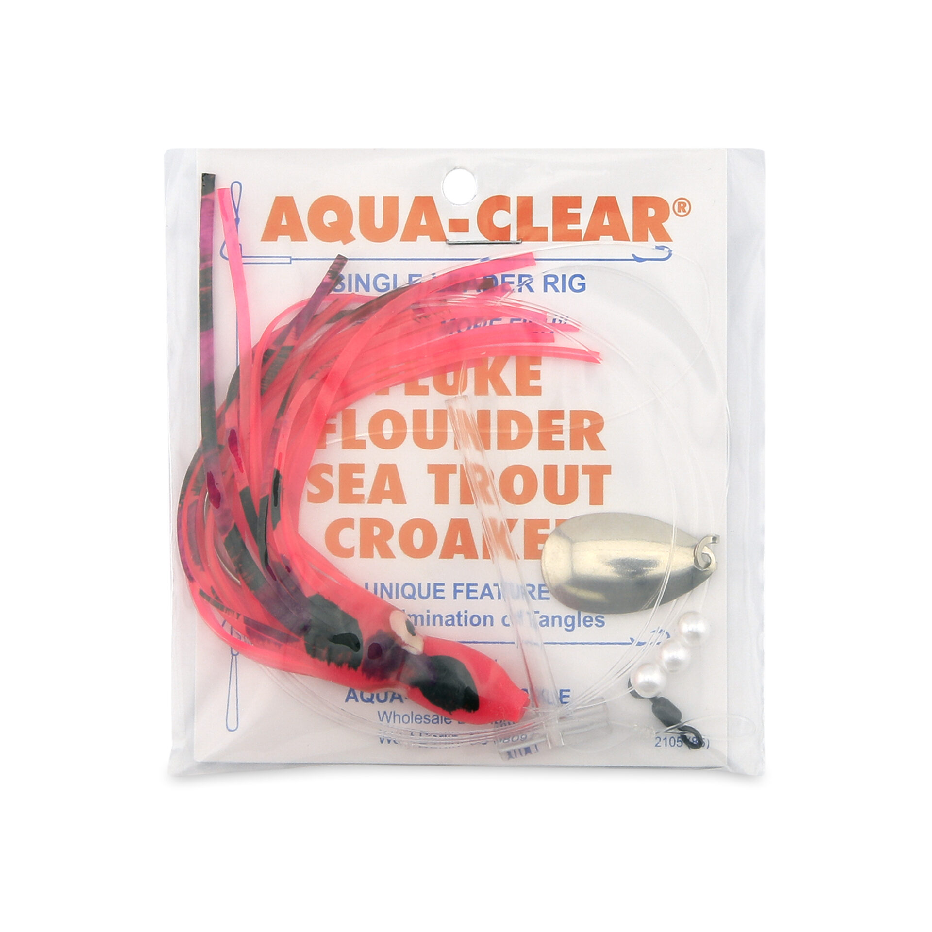 Aqua-Clear, Single Squid Teaser Rig, Flndr/Fluke/SeaTrout/Croaker, 3/0 XL Hook, AFW Swvl, 40 lb/18.1 kg GS Mono, T-Stndff, Lg Spinr, Flash Red/Black SquidAvailability: In stock