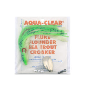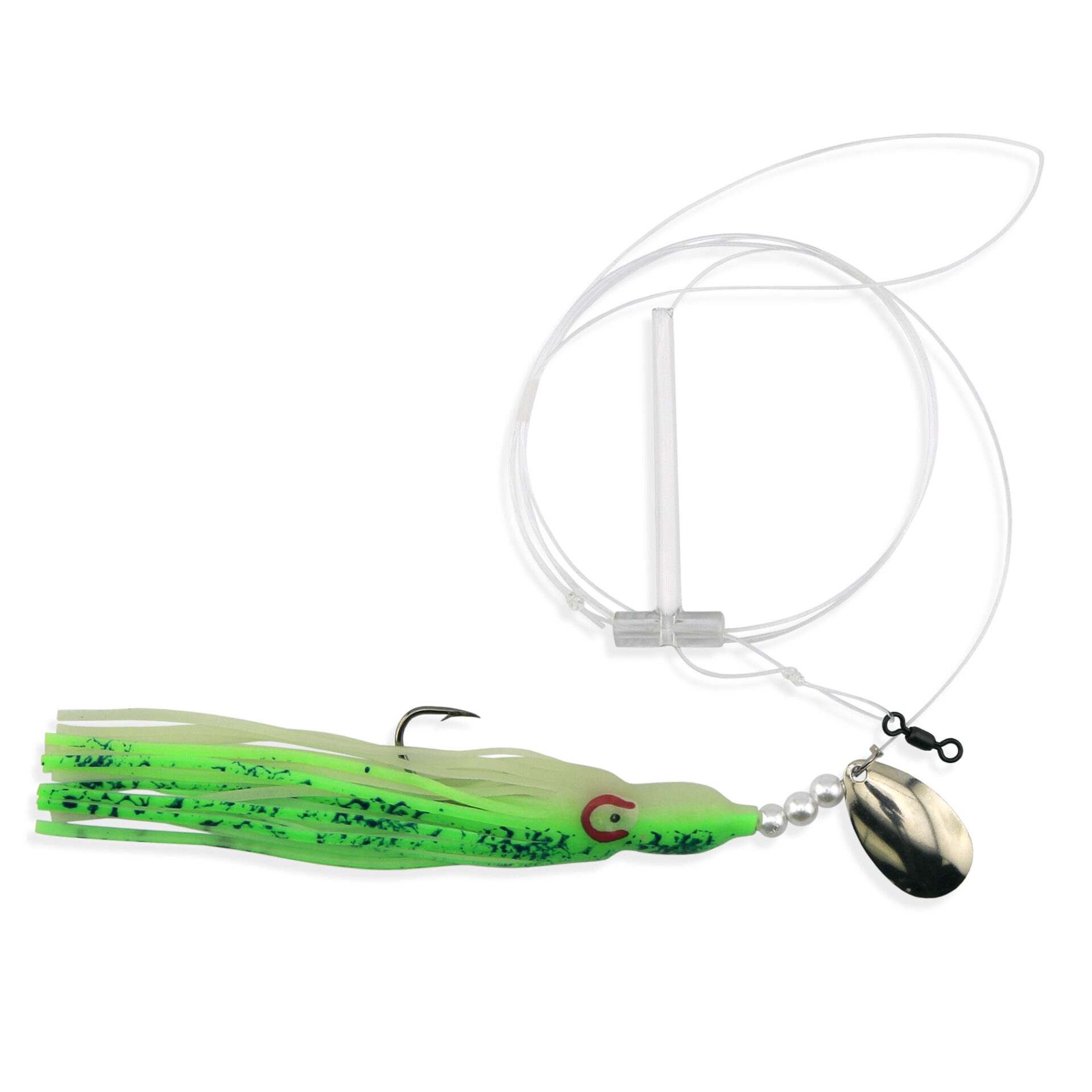 Aqua-Clear, Single Squid Teaser Rig, Flndr/Fluke/SeaTrout/Croaker, 3/0 XL Hook, AFW Swvl, 40 lb/18.1 kg GS Mono, T-Stndff, Lg Spinr, Swamp Thing Green/Black SquidAvailability: In stock