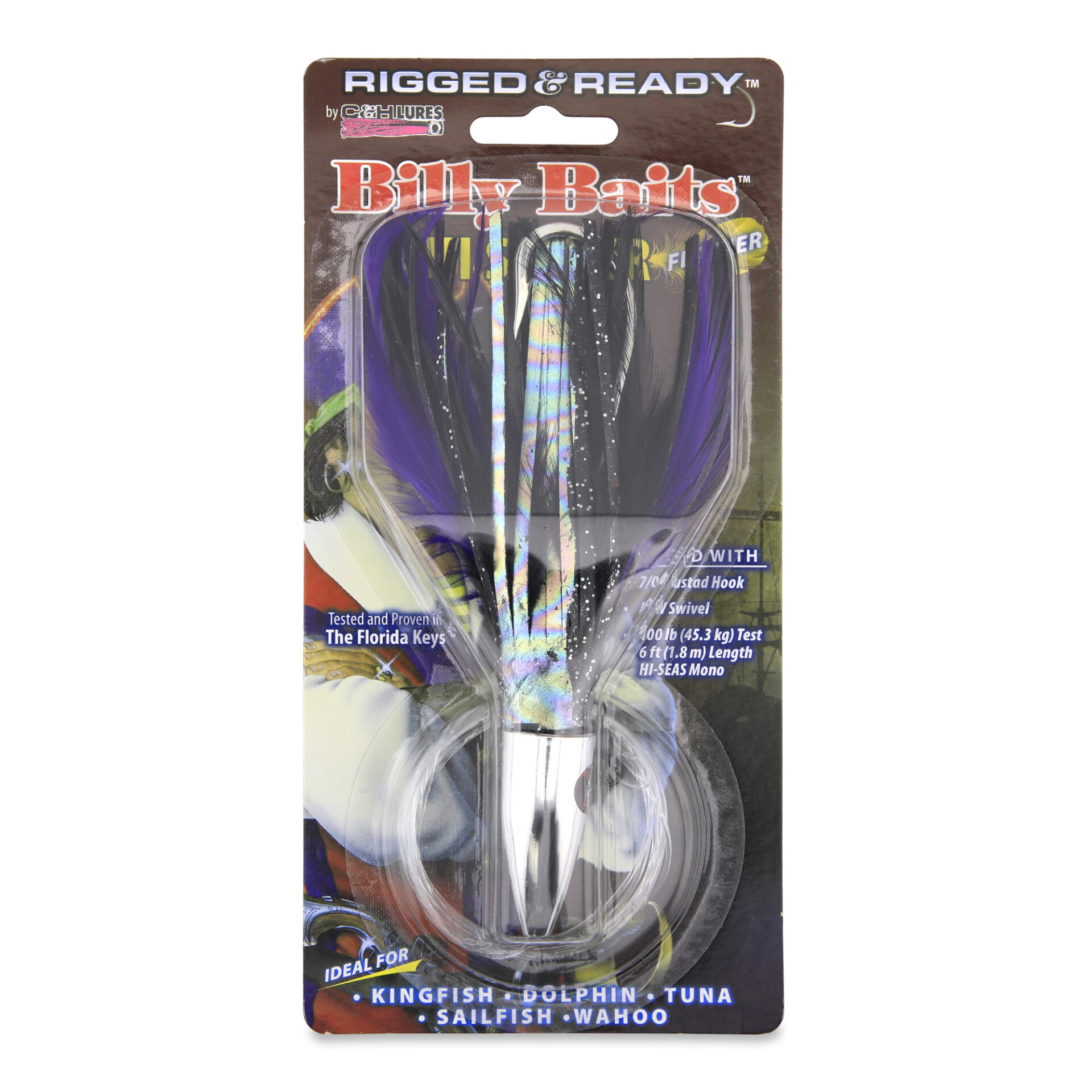 Billy Baits, Ahi Slayer Rigged & Ready, Black/Prpl Feather Skirt, 7/0 Mustad Hook, AFW Swivel, 100 lb / 45.3 kg Grand Slam Mono Line, 6 ft / 1.8 m