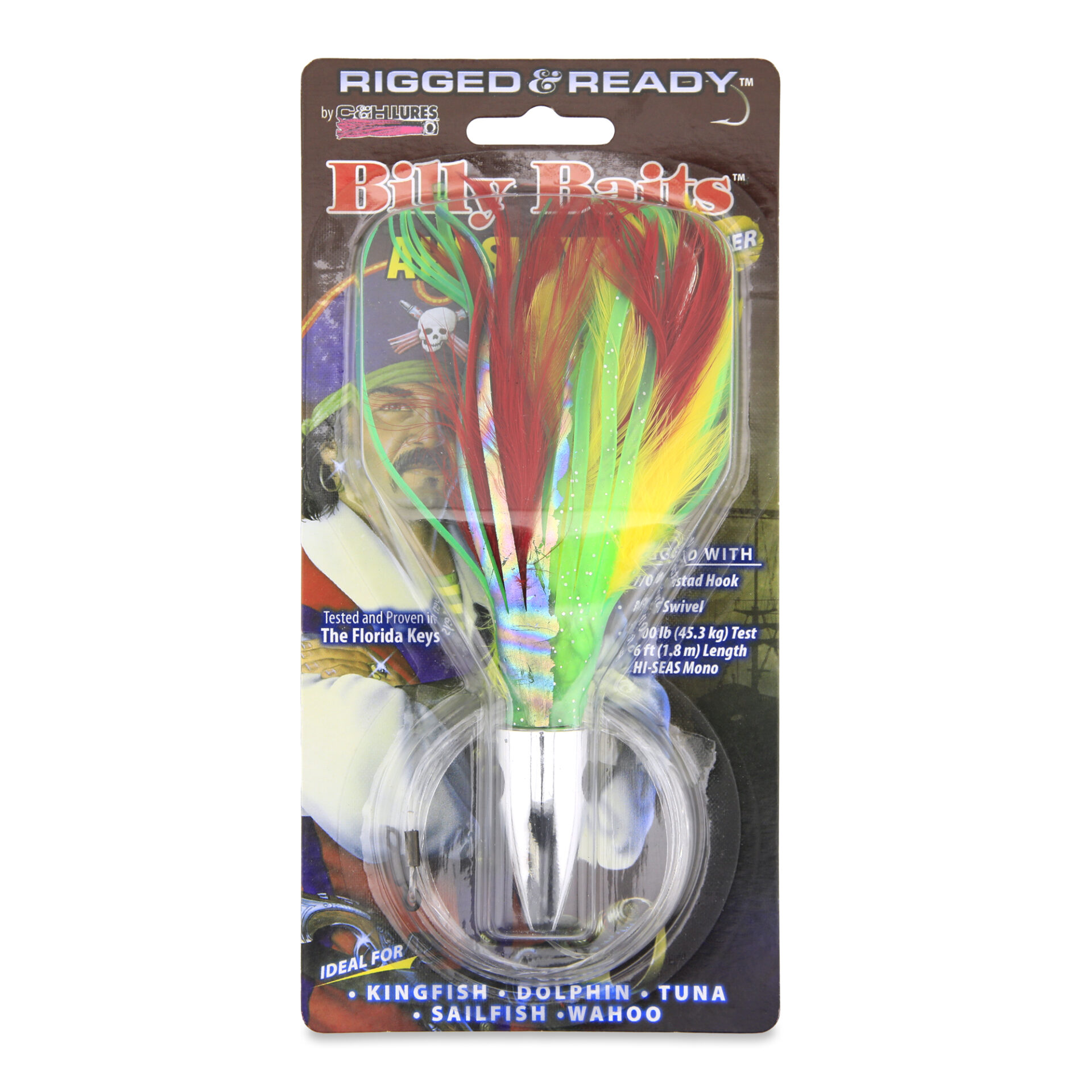 Billy Baits, Ahi Slayer Rigged & Ready, Dolphin Feather Skirt, 7/0 Mustad Hook, AFW Swivel, 100 lb / 45.3 kg Grand Slam Mono Line, 6 ft / 1.8 m