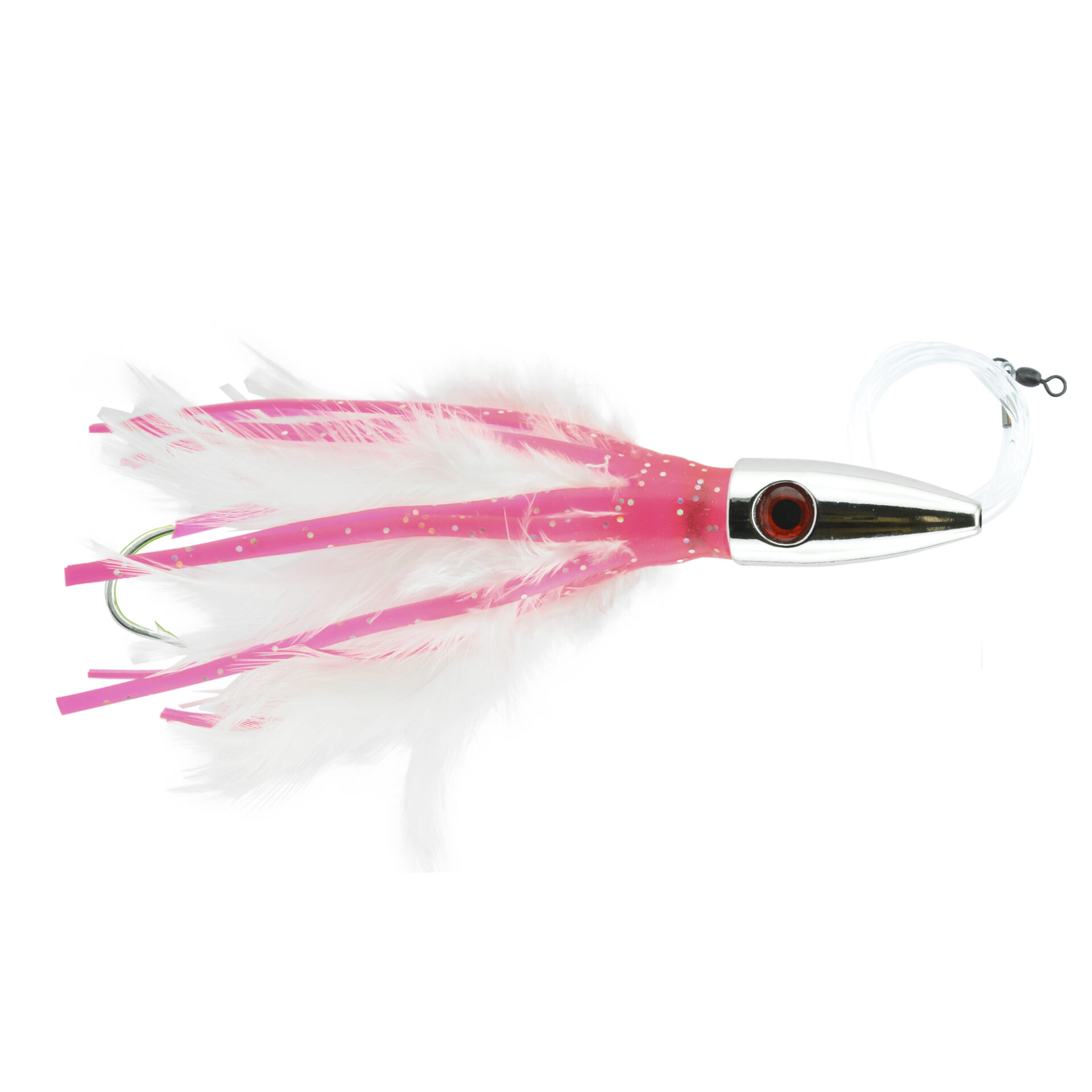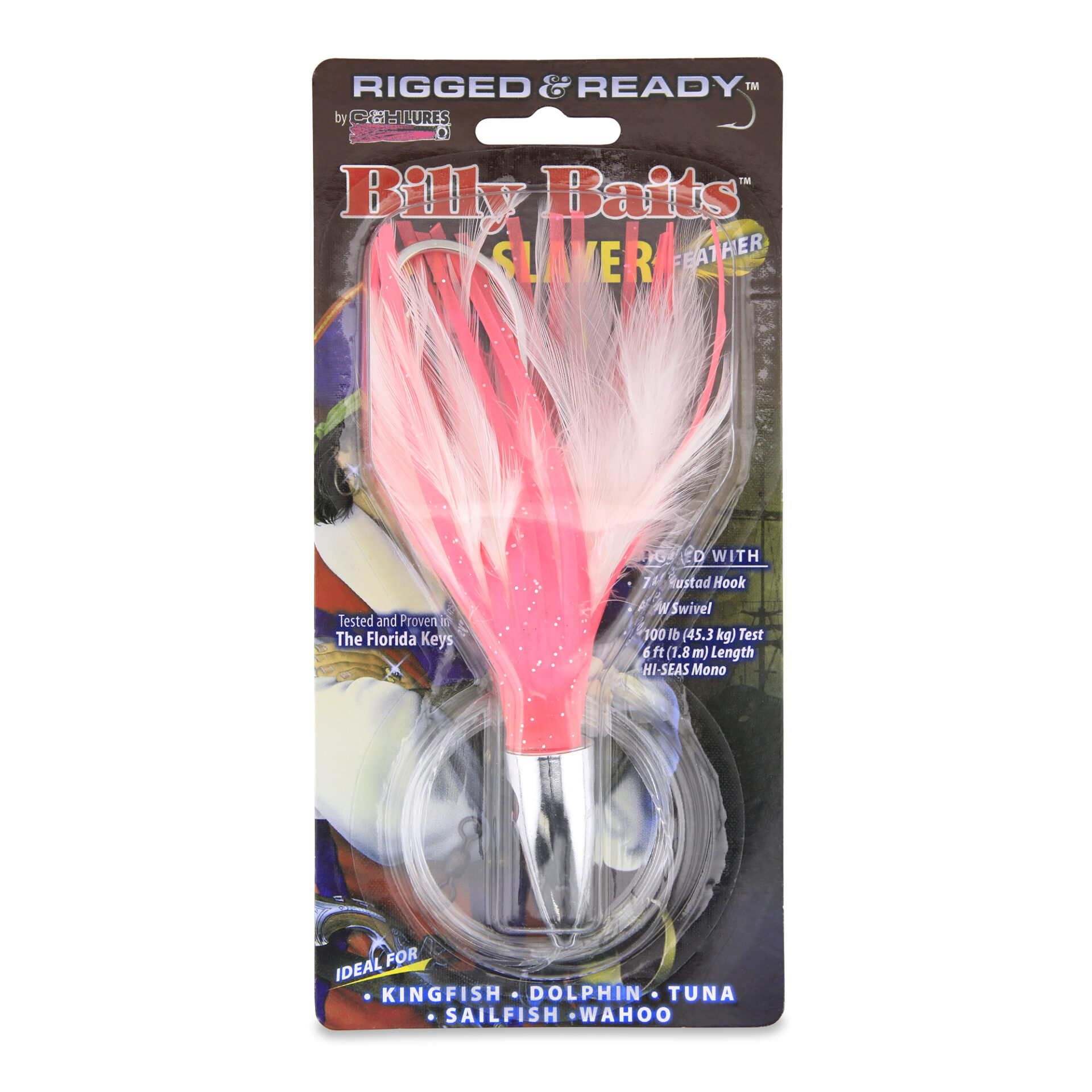Billy Baits, Ahi Slayer Rigged & Ready, Pink/White Feather Skirt, 7/0 Mustad Hook, AFW Swivel, 100 lb / 45.3 kg Grand Slam Mono Line, 6 ft / 1.8 m