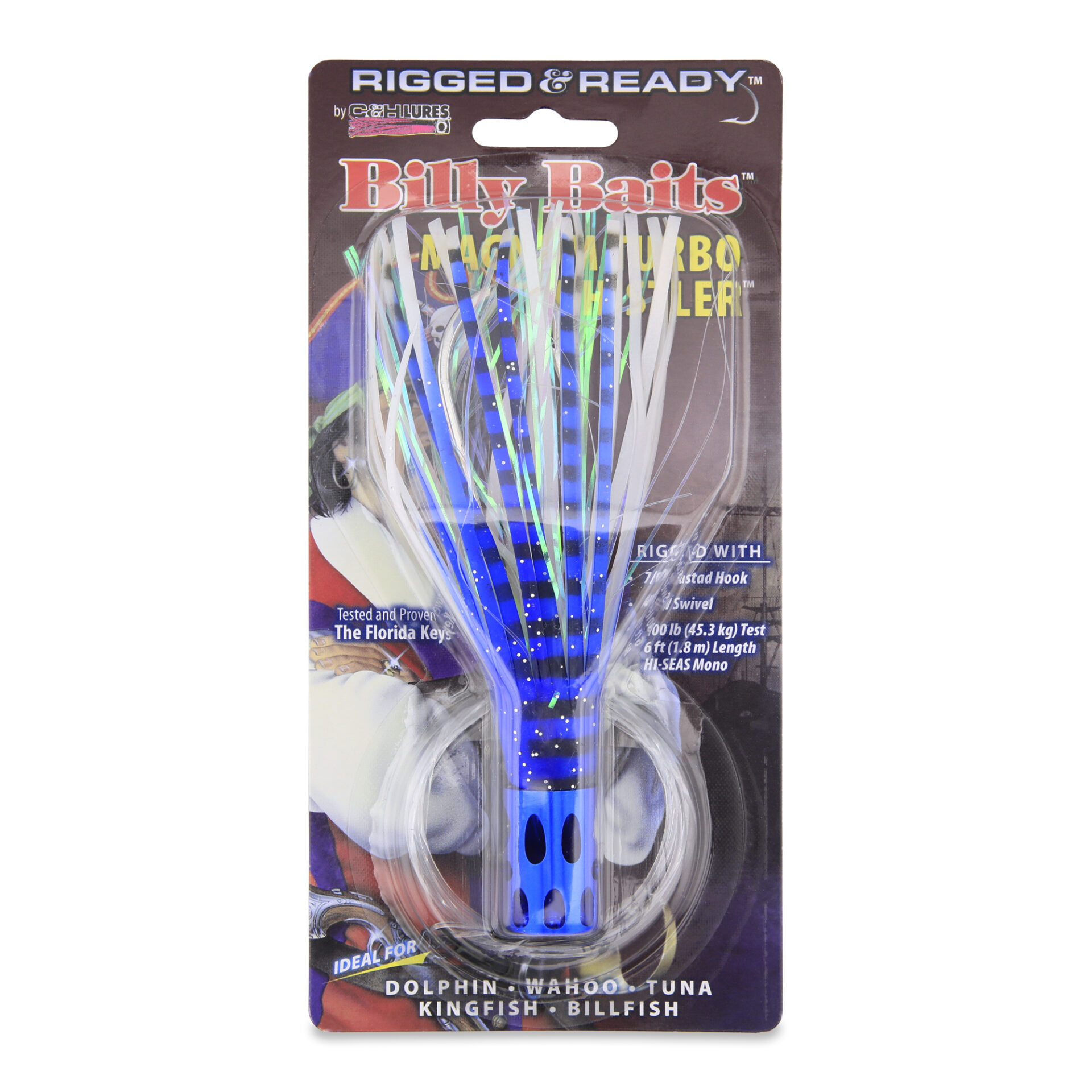 Billy Baits, Magnum Turbo Whistler Rigged & Ready, Blue/Pearl/Pearl Skirt, 2 oz / 56.6 g Head, 7/0 Mustad Hook, AFW Swivel, 100 lb / 45.3 kg Grand Slam Mono Line, 6 ft / 1.8 m