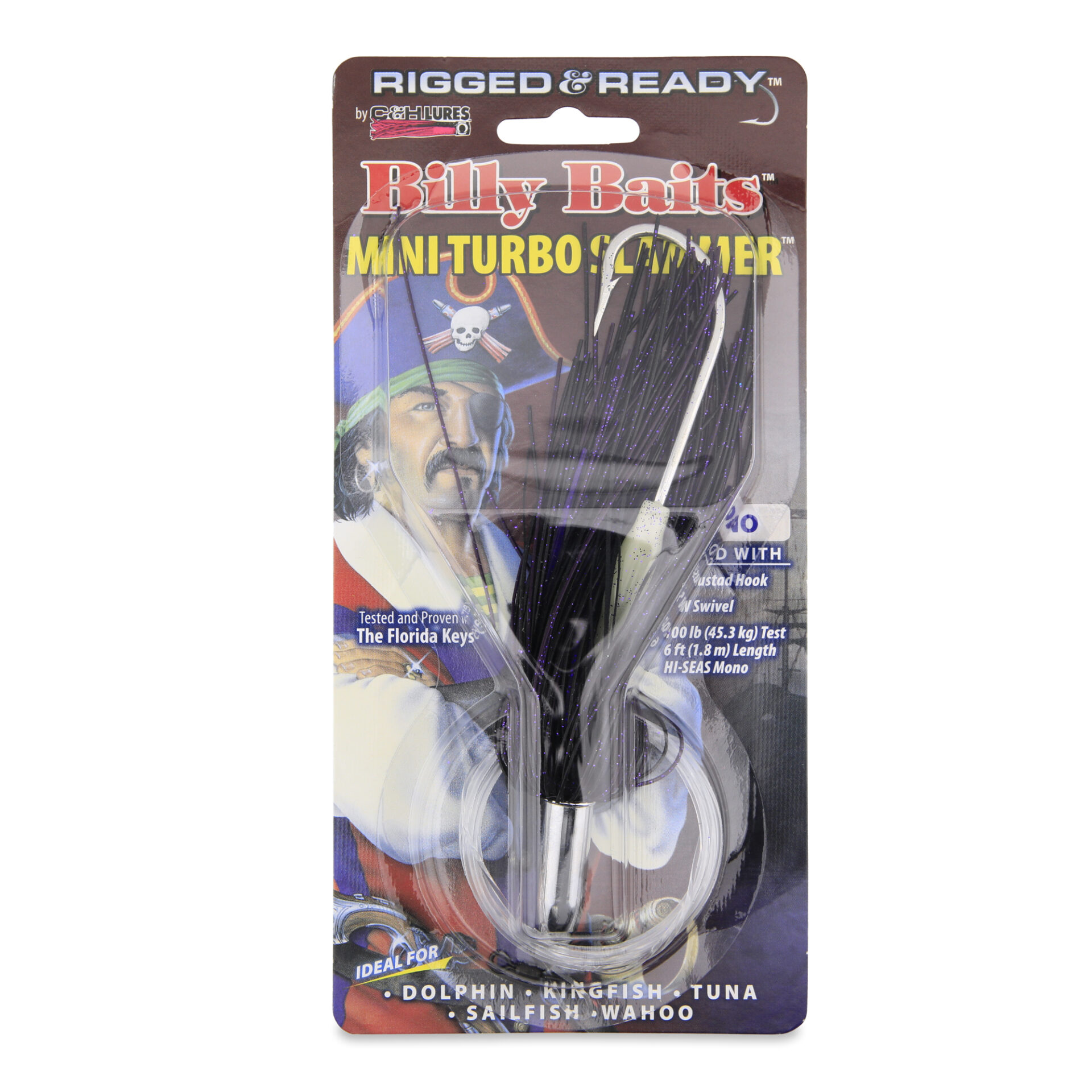 Billy Baits, Mini Turbo Slammer Rigged & Ready, Black-Purple/Purple Firetip, Concave Head, 7/0 Mustad Hook, AFW Swivel, 100 lb / 45.3 kg Grand Slam Mono Line, 6 ft / 1.8 m