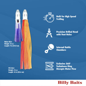 Billy Baits, Mister Big Lure, Blue/White PVC Skirt, 16 oz / 453 g Head, 16 in / 40.6 cm