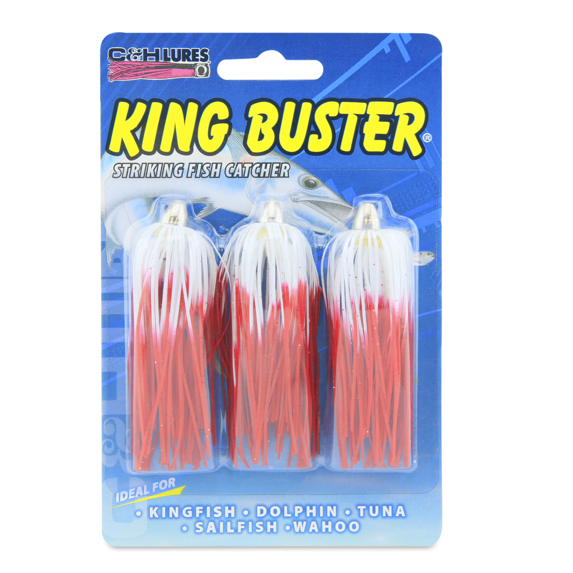 C&H, King Buster Lure, White/Red Fire Tail Skirt, 1/8 oz / 3.5 g Head, 2.5 in / 6.35 cm, 3 pc