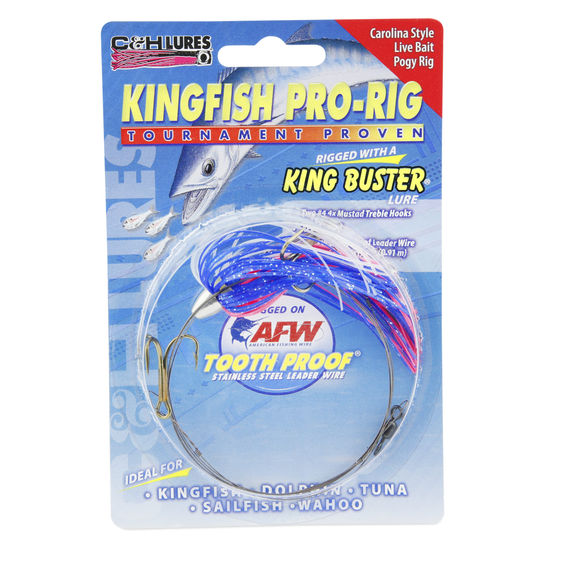 C&H, King Buster Pro-Rig, 1/8 oz / 3.5 g Head, Blue/Pink/Pearl Mylar Skirt, Two #4 4x Treble Hooks, AFW Swivel, AFW Tooth Proof Camo Brown Wire, 3 ft / 0.91 m