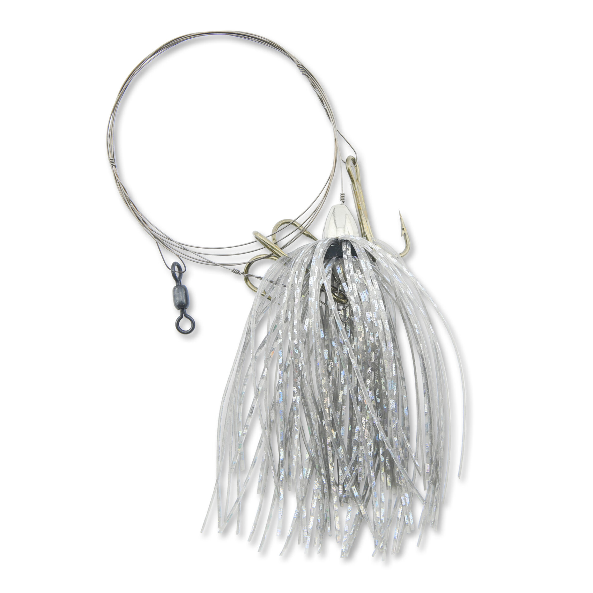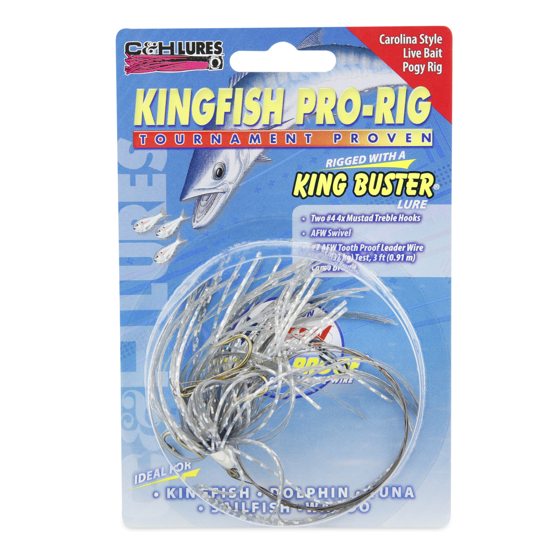 C&H, King Buster Pro-Rig, 1/8 oz / 3.5 g Head, Smoke/Chrome Skirt, Two #4 4x Treble Hooks, AFW Swivel, AFW Tooth Proof Camo Brown Wire, 3 ft / 0.91 m