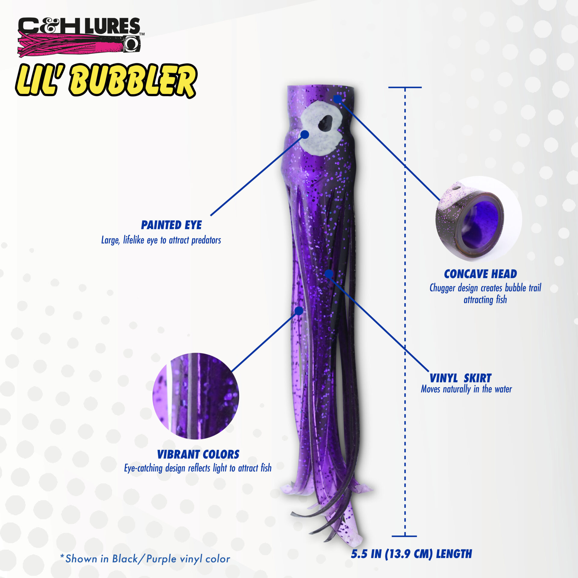 C&H, Lil Bubbler Lure, Rainbow Skirt, Concave Head, 5.5 in / 14 cm