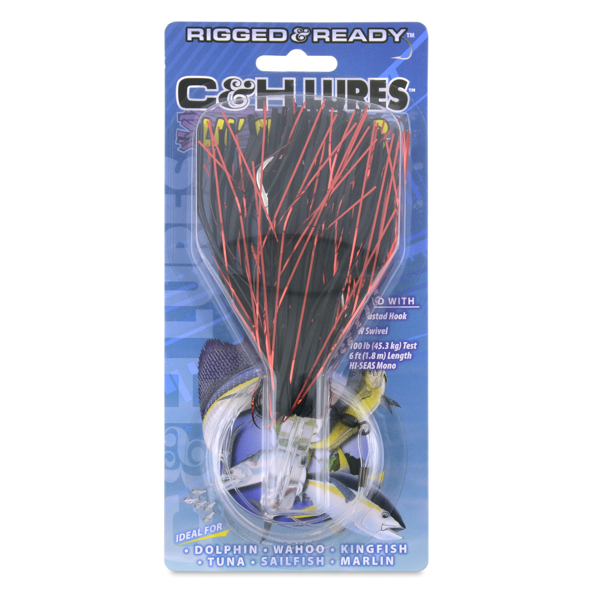 C&H, Lil Swimmer Rig, Black/Red Mylar Skirt, 7/0 Mustad Hook, AFW Swivel, 100 lb / 45.3 kg Grand Slam Mono Line, 6 ft / 1.8 m