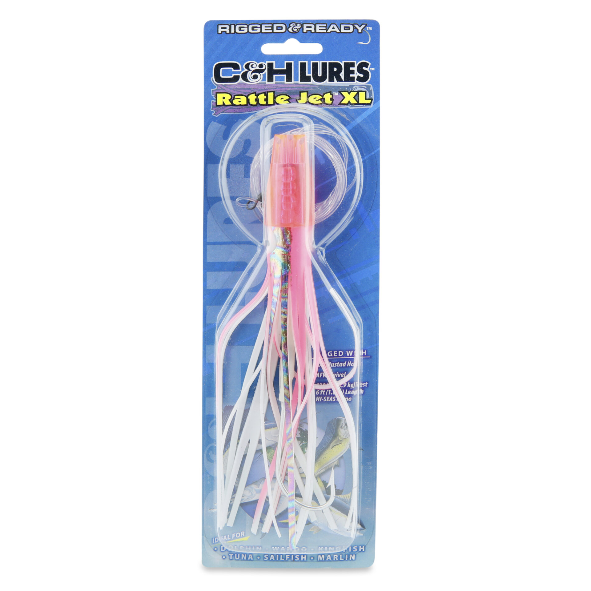 C&H, Rattle Jet XL Rigged & Ready, Pink-Foil/White Skirt, 8/0 Mustad Hook, AFW Swivel, 130 lb / 58.9 kg Grand Slam Mono Line, 6 ft / 1.8 m