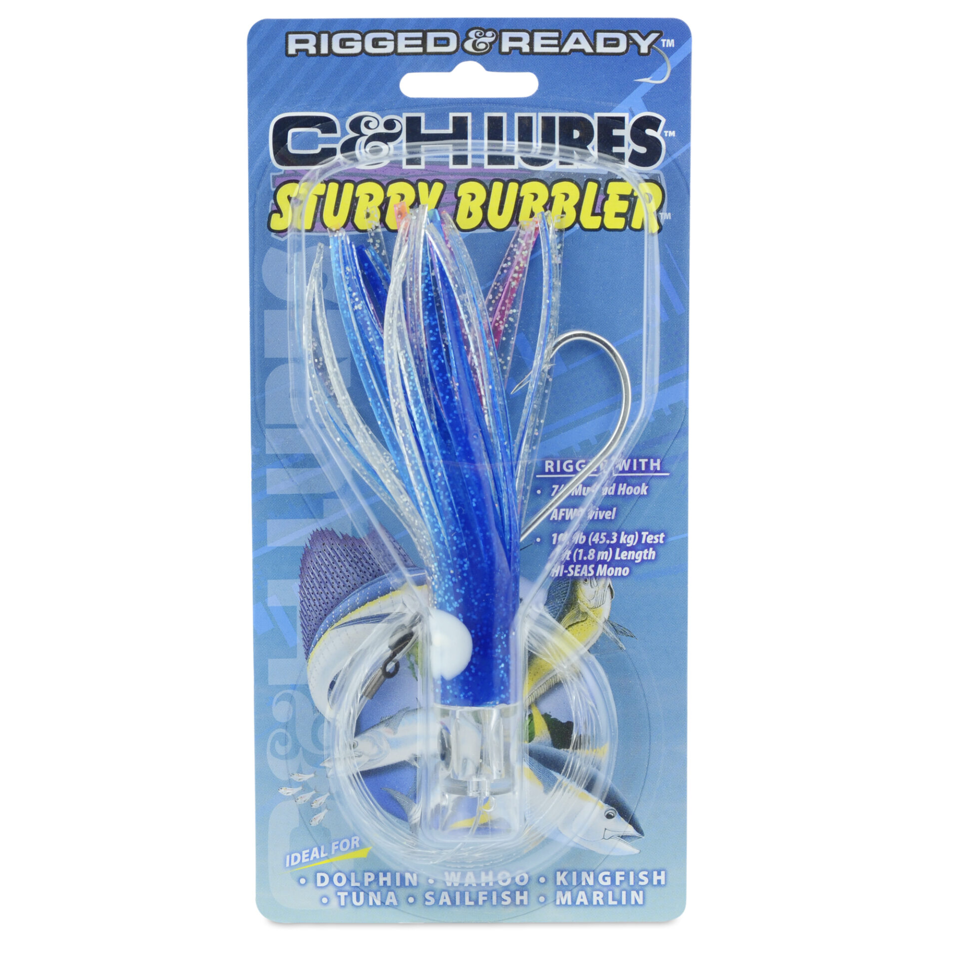 C&H, Stubby Bubbler Rigged & Ready, Blue/Silver/Pink Skirt, 7/0 Mustad Hook, AFW Swivel, 100 lb / 45.3 kg Grand Slam Mono Line, 6 ft / 1.8 m