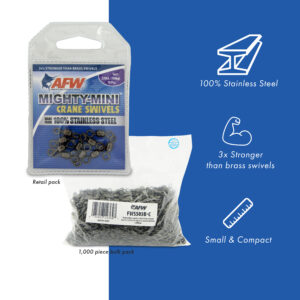 Mighty-Mini Crane Swivels are 100% stainless steel and are 3 times stronger than conventional components of the same size. Smart anglers know that terminal tackle can spook wary game fish. The Might Mini line of compact, 100% stainless steel swivels was engineered to be smaller and stronger than the leading brands of swivels on the market. Now you can use swivels for your rigs, and snap swivels for attaching lures, that are less visible and significantly more powerful.