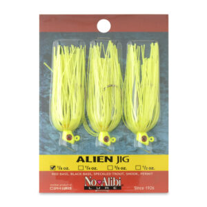 No Alibi, Alien Jig Inshore Series, Glow Chartreuse Skirt, 1/8 oz / 3.5 g Chartreuse Head, 4/0 Hook, 3 pc