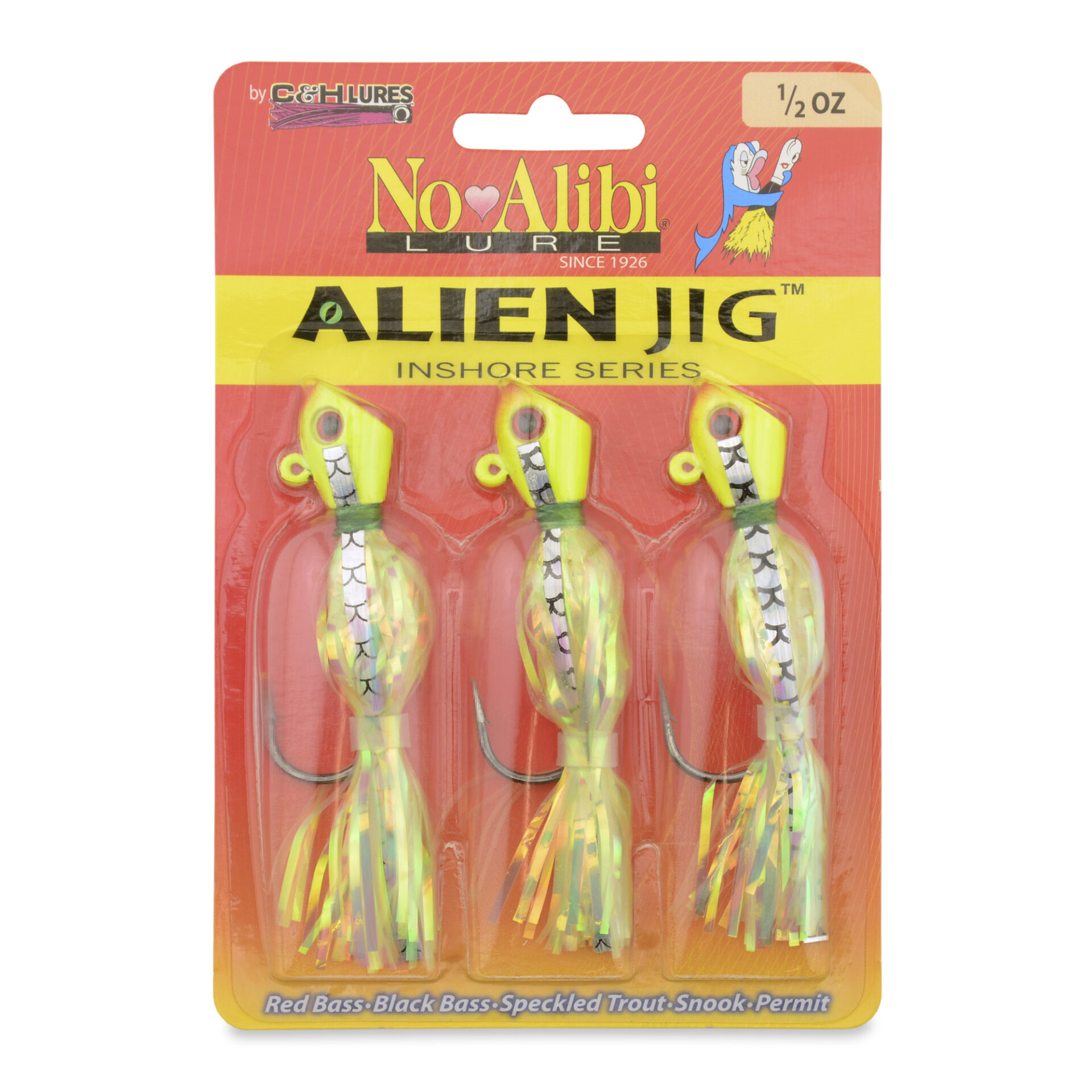 No Alibi, Alien Jig Inshore Series, Pearl Green Skirt, 1/2 oz / 14.1 g Green Head, 5/0 Hook, 3 pc