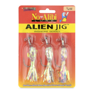No Alibi, Alien Jig Inshore Series, Pearl Skirt, 3/8 oz / 10.6 g Red Head, 5/0 Hook, 3 pc