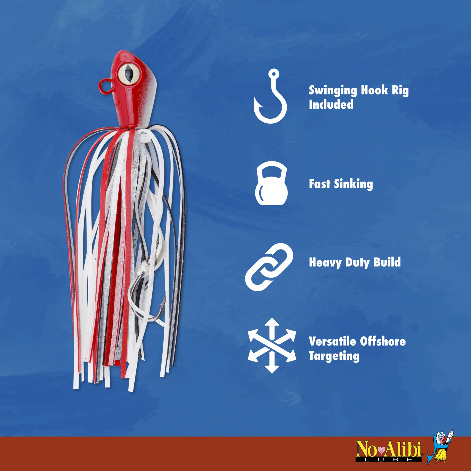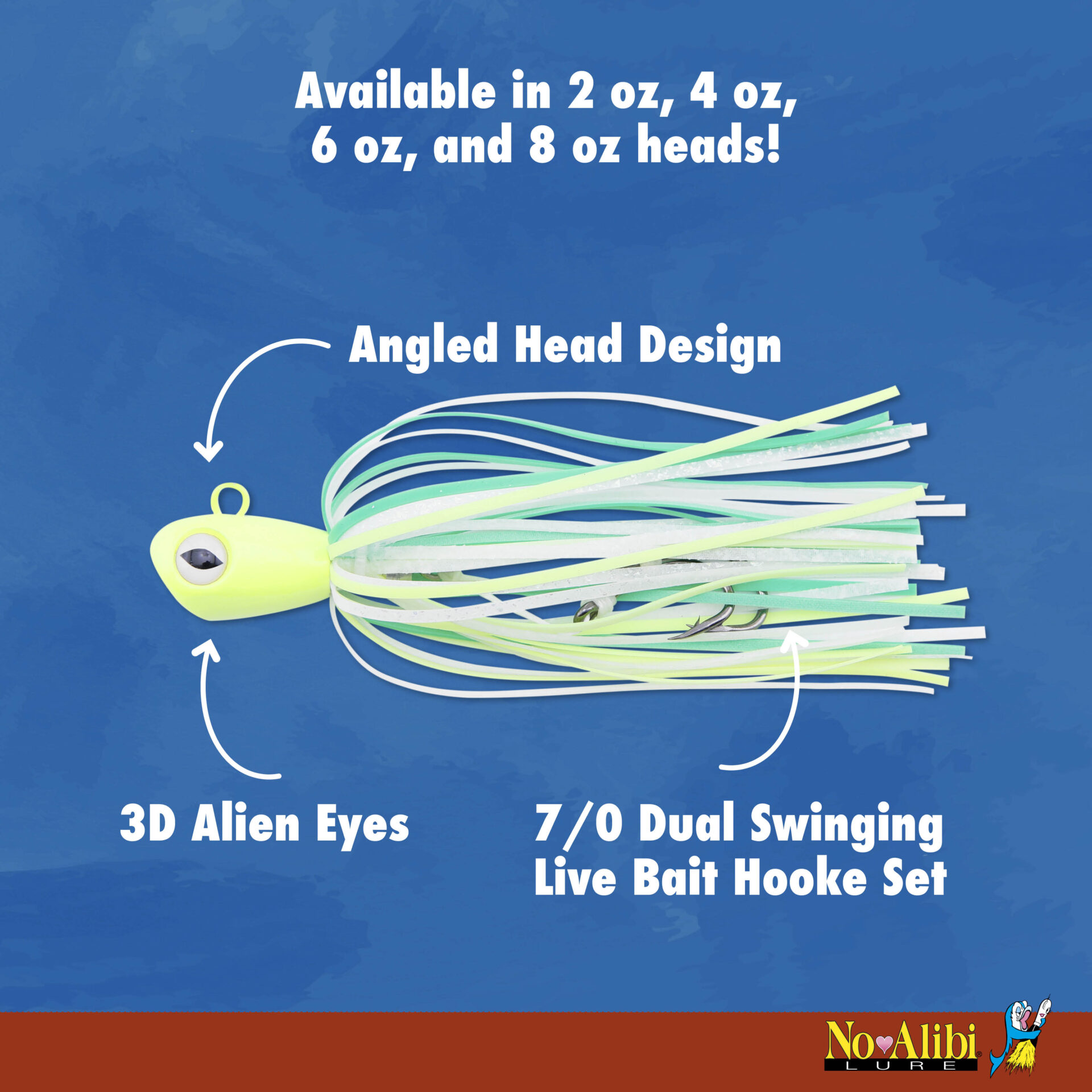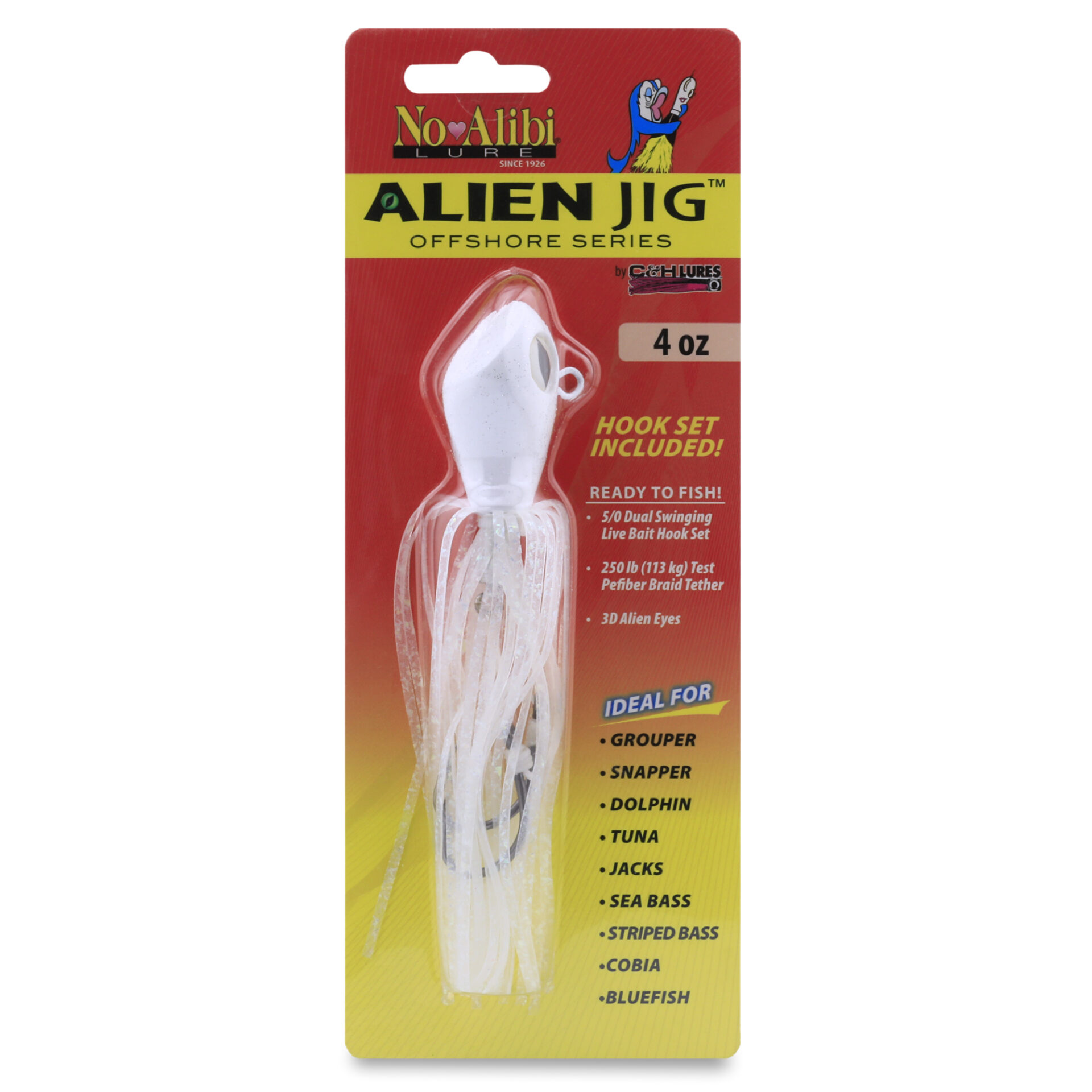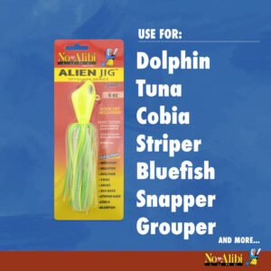 No Alibi, Alien Jig Offshore Series, Fluorescent White Skirt, 4 oz / 113 g White Head, 5/0 Hooks (2)