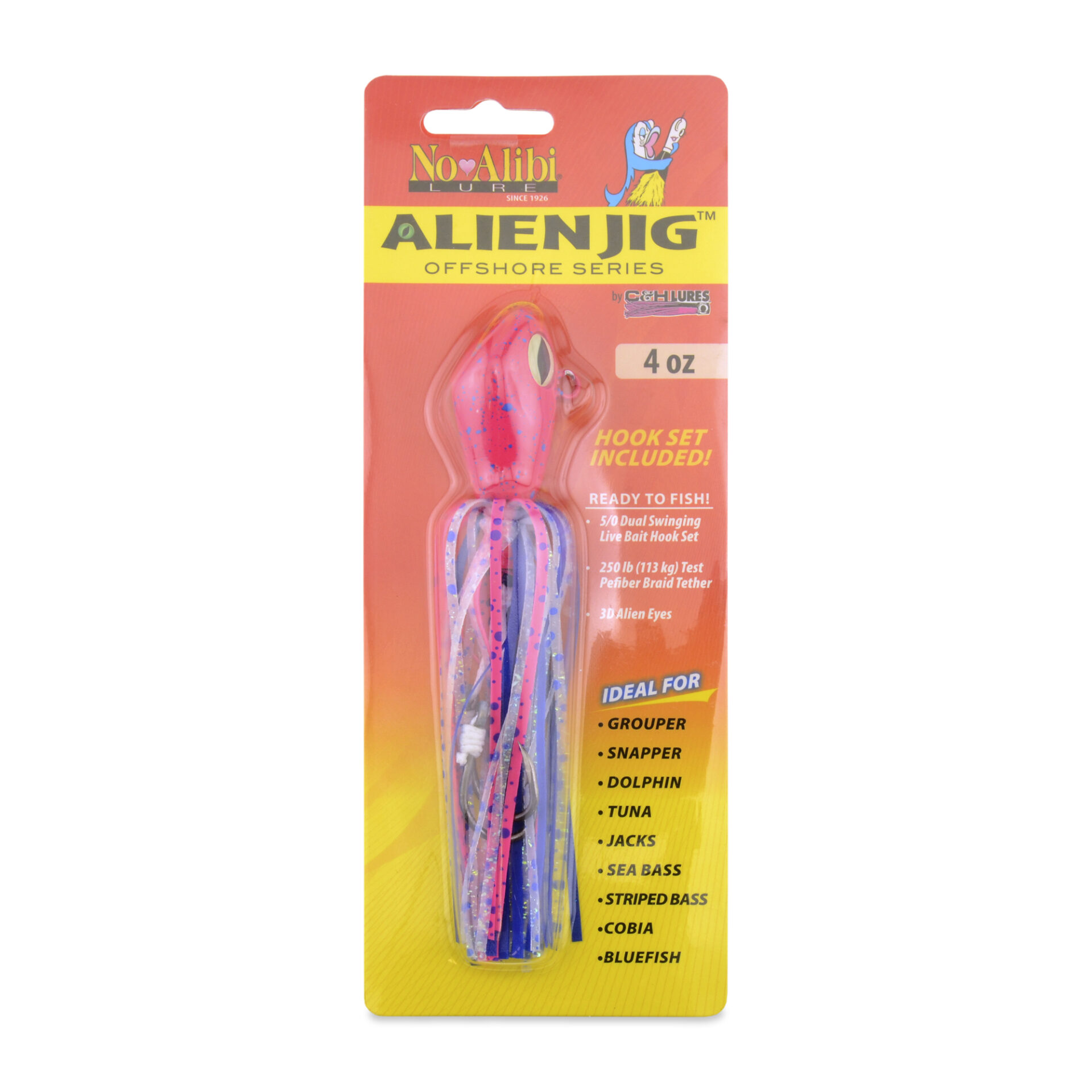 No Alibi, Alien Jig Offshore Series, Pink/Blue/White Speckled Skirt, 4 oz / 113 g Pink/Blue Head, 5/0  Hooks (2)No Alibi, Alien Jig Offshore Series, Pink/Blue/White Speckled Skirt, 4 oz / 113 g Pink/Blue Head, 5/0 Hooks (2)