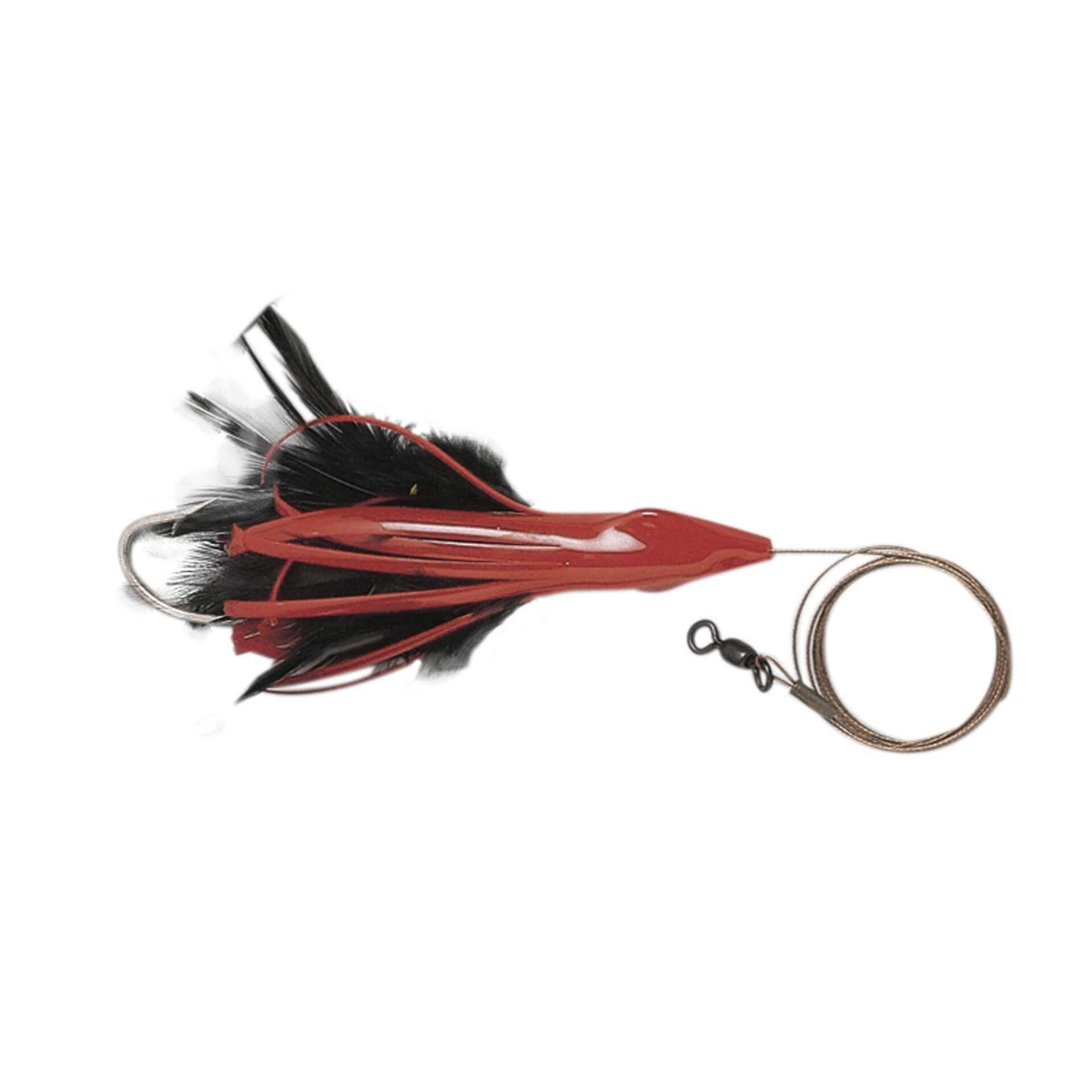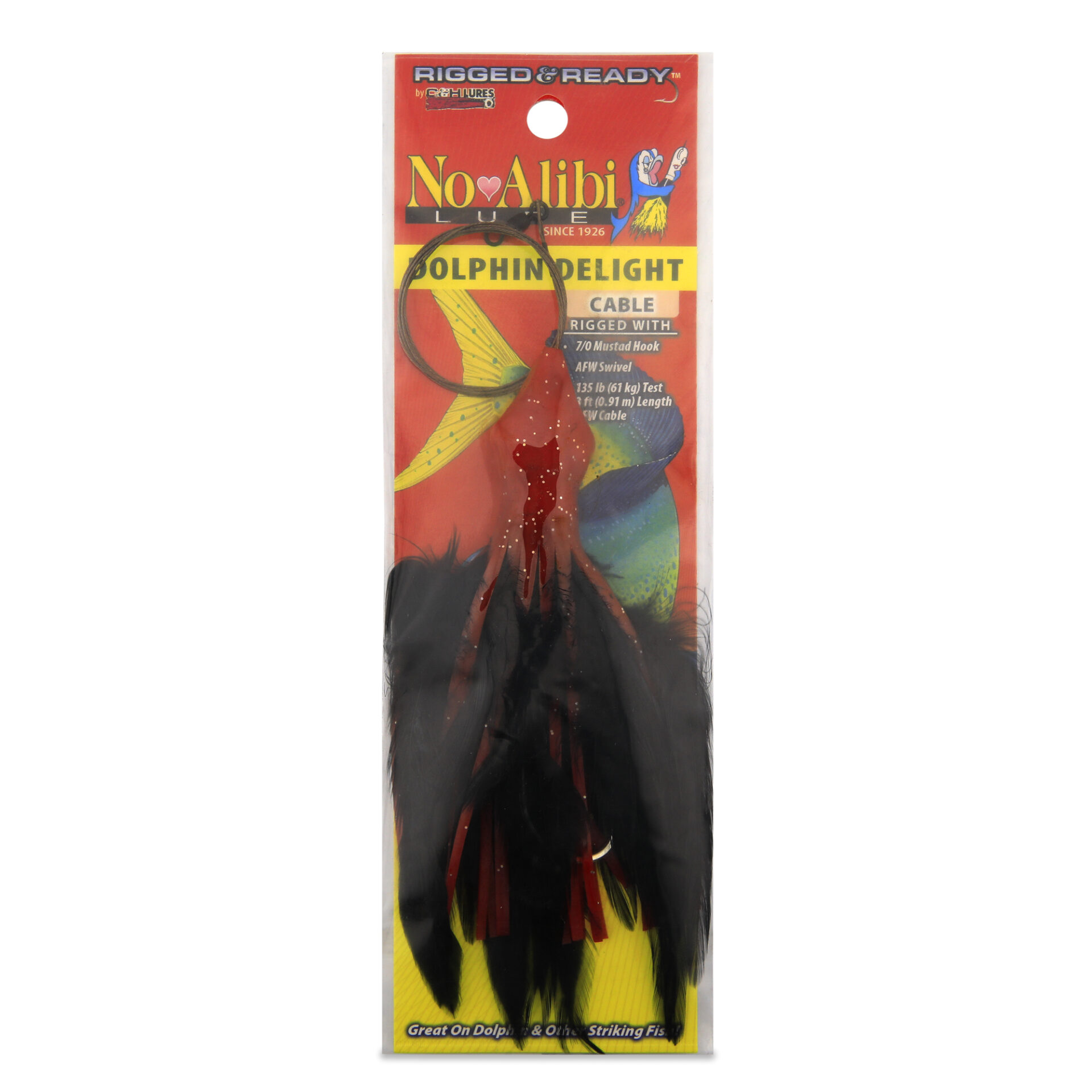 No Alibi, Dolphin Delight Rigged & Ready, Black/Red Skirt, 1.5 oz / 42.5 g Lead Head, 6 in / 15.2 cm, 7/0 Mustad Hook, AFW Swivel, 135 lb / 61 kg AFW Cable, 3 ft / 0.9 m