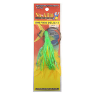 No Alibi, Dolphin Delight Rigged & Ready, Green/Yellow Skirt, 1/4 oz / 7.0 g Lead Head, 4.5 in / 11.4 cm, 7/0 Mustad Hook, AFW Swivel, 135 lb / 61 kg AFW Cable, 3 ft / 0.9 m