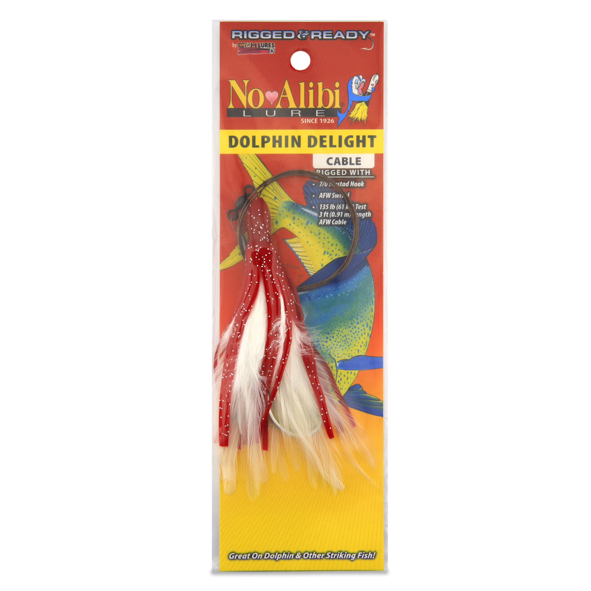 No Alibi, Dolphin Delight Rigged & Ready, Red/White Skirt, 1/4 oz / 7.0 g Lead Head, 4.5 in / 11.4 cm, 7/0 Mustad Hook, AFW Swivel, 135 lb / 61 kg AFW Cable, 3 ft / 0.9 mNo Alibi, Dolphin Delight Rigged & Ready, Red/White Skirt, 1/4 oz / 7.0 g Lead Head, 4.5 in / 11.4 cm, 7/0 Mustad Hook, AFW Swivel, 135 lb / 61 kg AFW Cable, 3 ft / 0.9 m