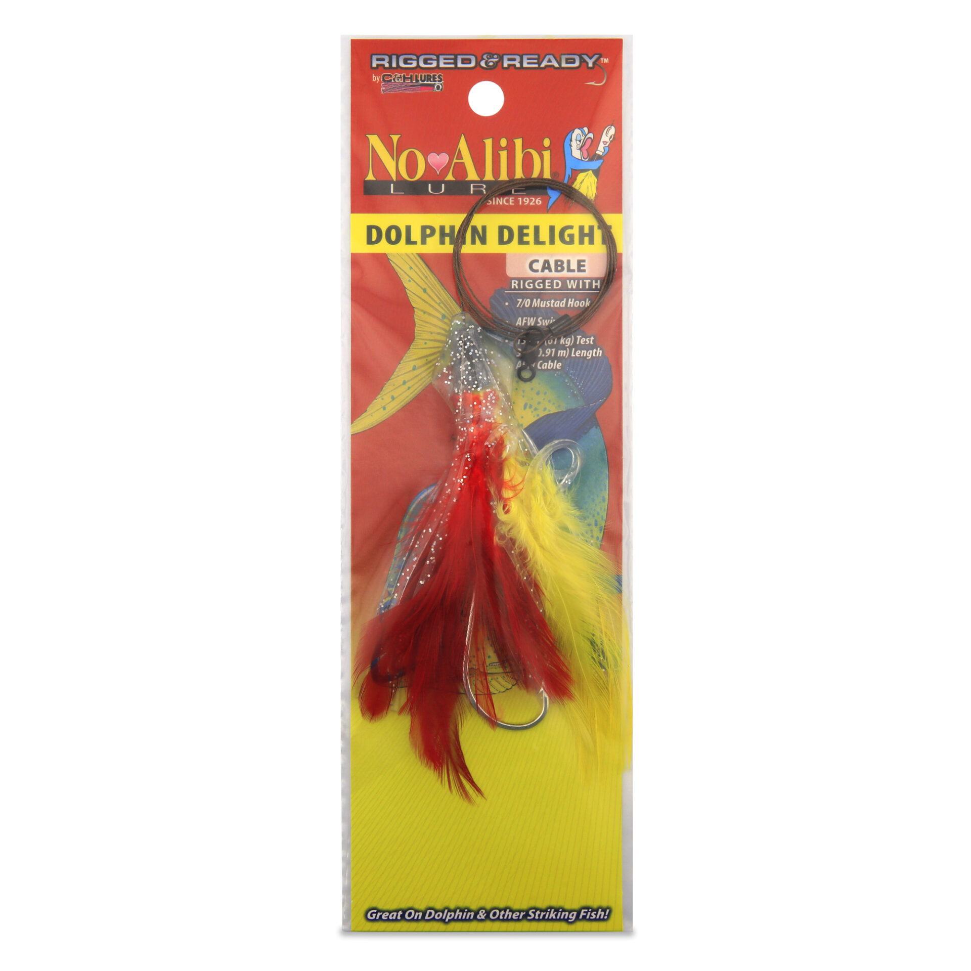 No Alibi, Dolphin Delight Rigged & Ready, Silvr/Red/Yel Skirt, 1/2 oz / 14.1 g Lead Head, 6 in / 15.2 cm, 7/0 Mustad Hook, AFW Swivel, 135 lb / 61 kg AFW Cable, 3 ft / 0.9 m