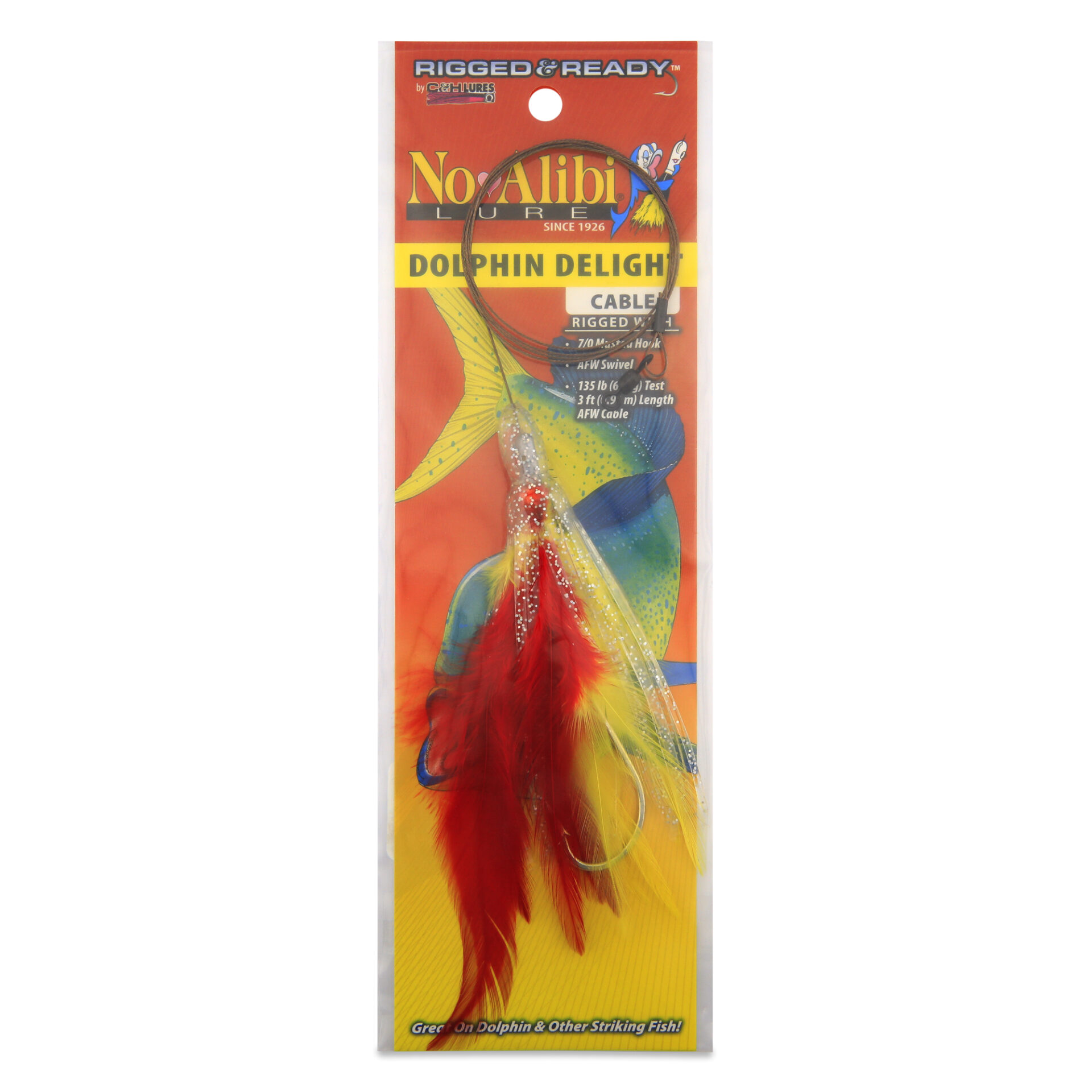 No Alibi, Dolphin Delight Rigged & Ready, Silvr/Red/Yel Skirt, 1/4 oz / 7.0 g Lead Head, 6 in / 15.2 cm, 7/0 Mustad Hook, AFW Swivel, 135 lb / 61 kg AFW Cable, 3 ft / 0.9 mNo Alibi, Dolphin Delight Rigged & Ready, Silvr/Red/Yel Skirt, 1/4 oz / 7.0 g Lead Head, 6 in / 15.2 cm, 7/0 Mustad Hook, AFW Swivel, 135 lb / 61 kg AFW Cable, 3 ft / 0.9 m