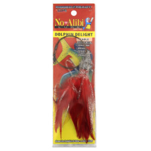 No Alibi, Dolphin Delight Rigged & Ready, Silvr/Red/Yel Skirt, 1.5 oz / 42.5 g Lead Head, 6 in / 15.2 cm, 7/0 Mustad Hook, AFW Swivel, 135 lb / 61 kg AFW Cable, 3 ft / 0.9 m