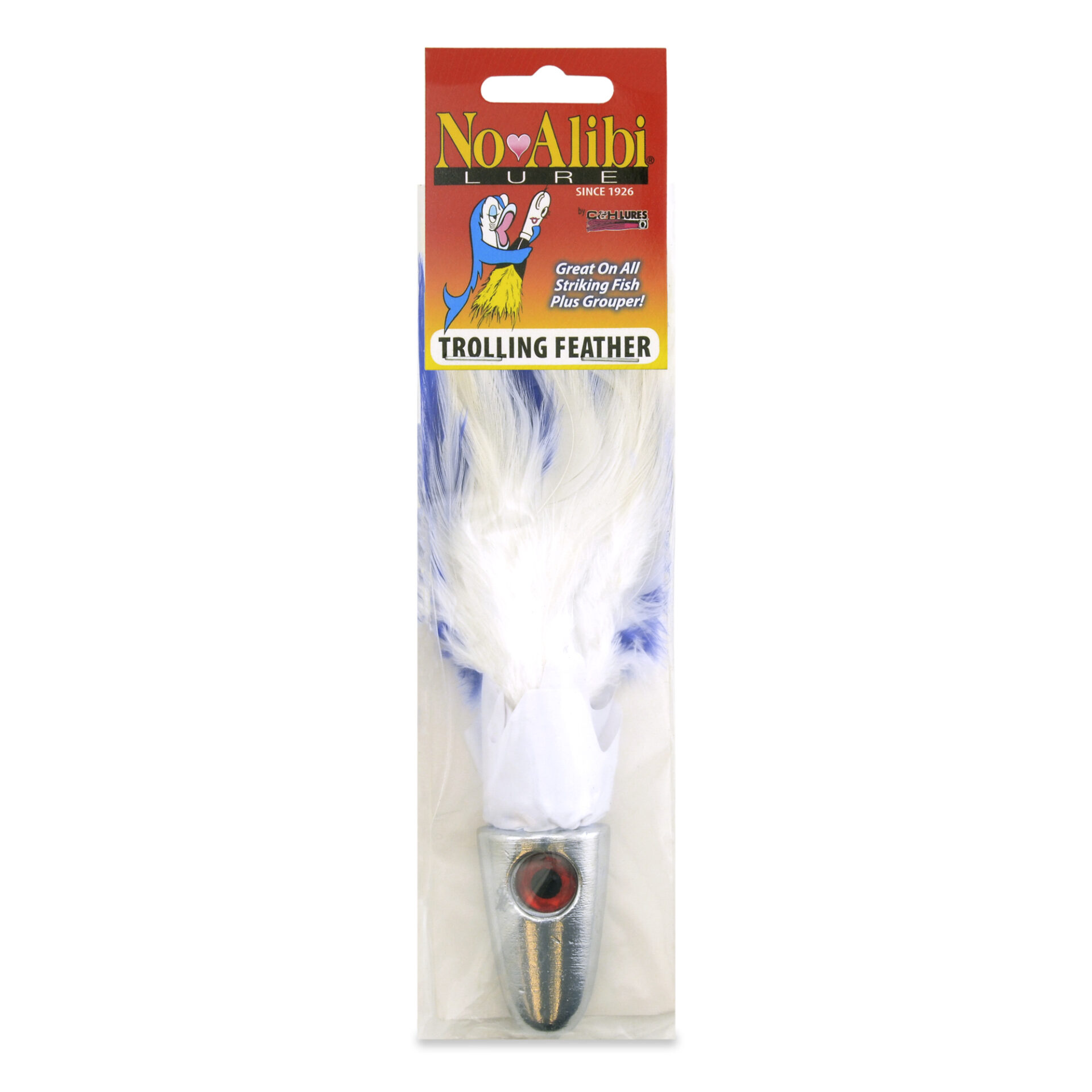 No Alibi, Trolling Feather Lure, White/Blue Skirt, 8 oz / 226 g Head