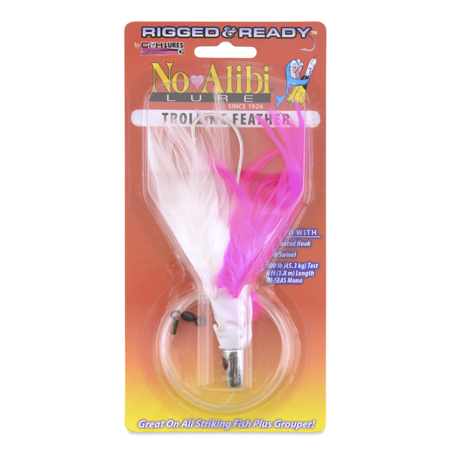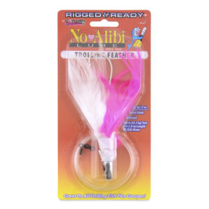 No Alibi,Trolling Feather Rigged & Ready, White/Pink Skirt, 1 oz / 28.3 g, 7/0 Mustad Hook, AFW Swivel, 100 lb / 45.3 kg Grand Slam Mono Line, 6 ft / 1.8 m