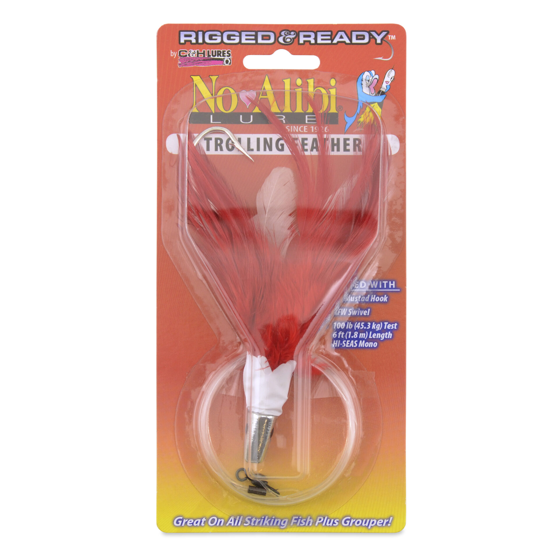 No Alibi,Trolling Feather Rigged & Ready, White/Red Skirt, 1 oz / 28.3 g, 7/0 Mustad Hook, AFW Swivel, 100 lb / 45.3 kg Grand Slam Mono Line, 6 ft / 1.8 m