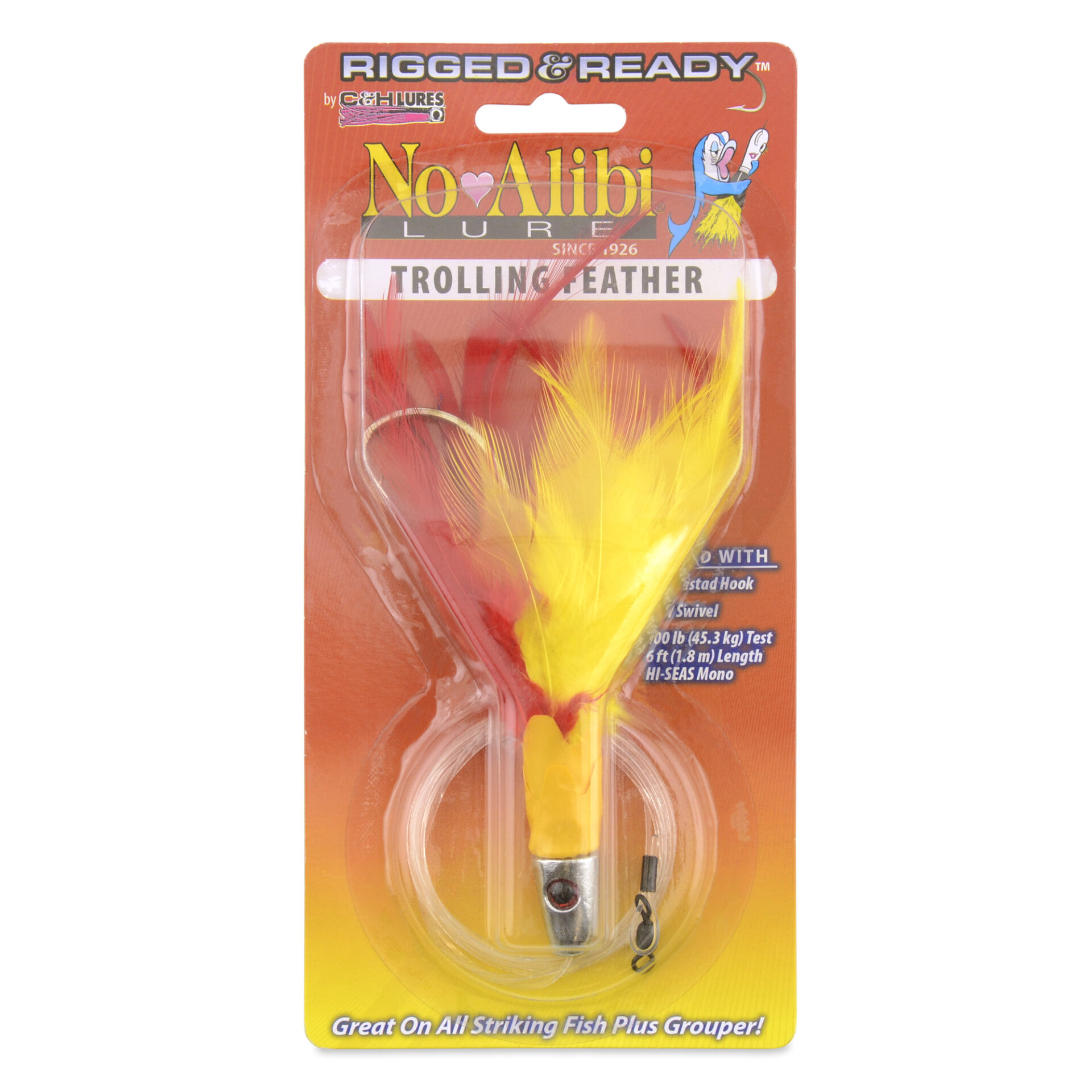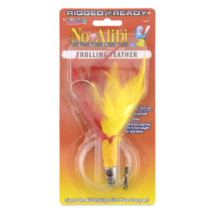 No Alibi,Trolling Feather Rigged & Ready, Yellow/Red Skirt, 1 oz / 28.3 g, 7/0 Mustad Hook, AFW Swivel, 100 lb / 45.3 kg Grand Slam Mono Line, 6 ft / 1.8 m