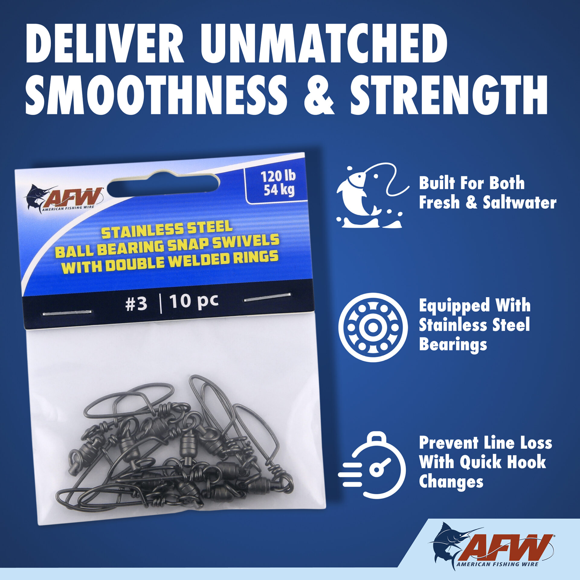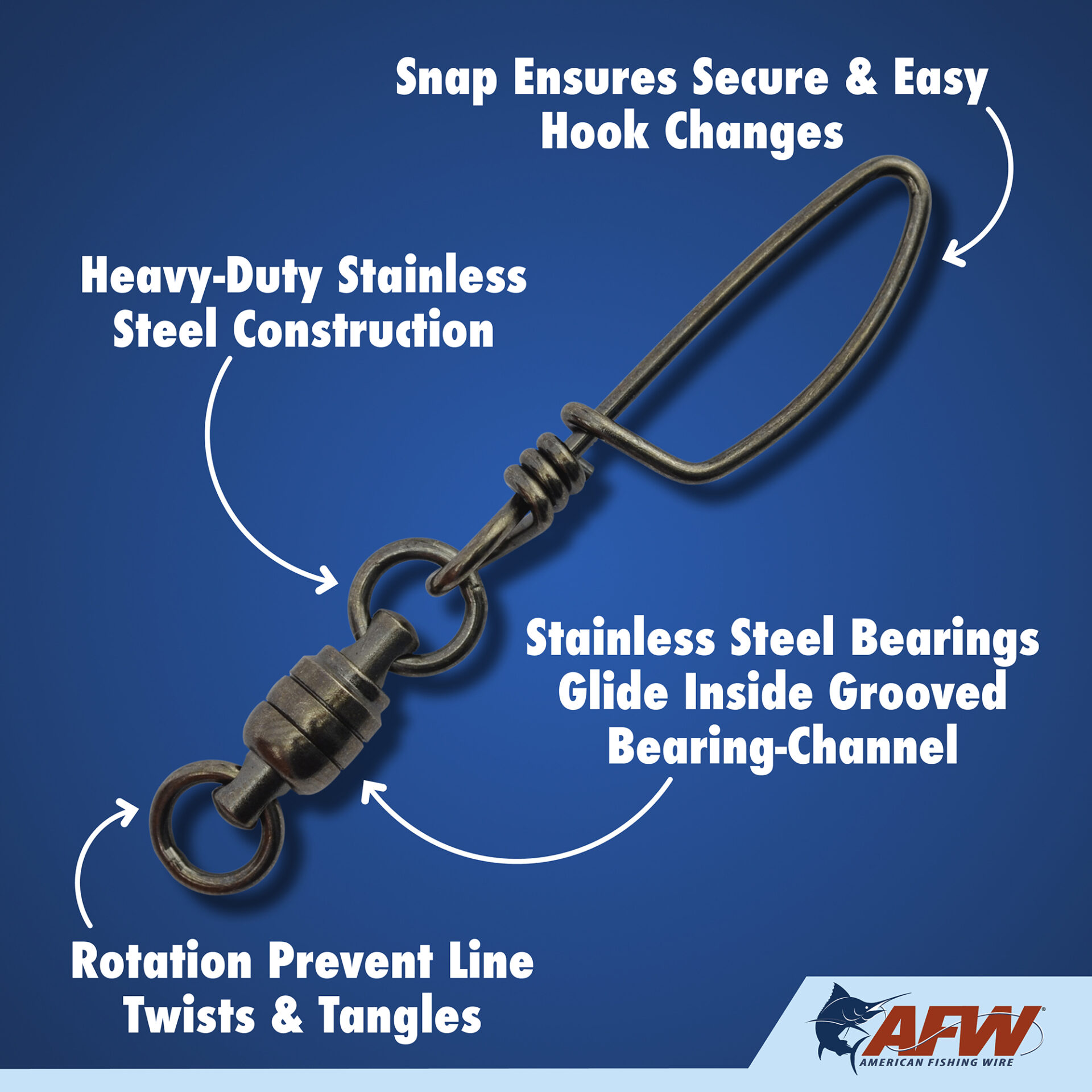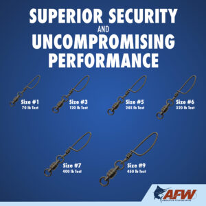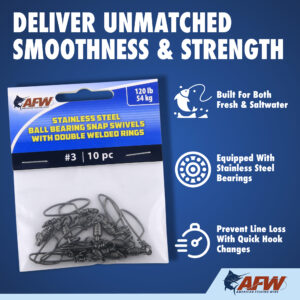 These dual-rotation solid stainless steel Ball Bearing Snap Swivels are engineered to survive the fiercest one-on-one battles. The patented bullet shape provides fluid rotation and decreased water resistance. The unique gun metal black finish minimizes reflections and cloaks the tackle. Swivels have a solid stainless steel body, stainless steel bearings, and welded rings for maximum security and to endure the unforgiving offshore environment. The tournament snaps are tempered and made of solid stainless steel, designed to stay closed and keep you connected to the fish. Patented D549,750 S.