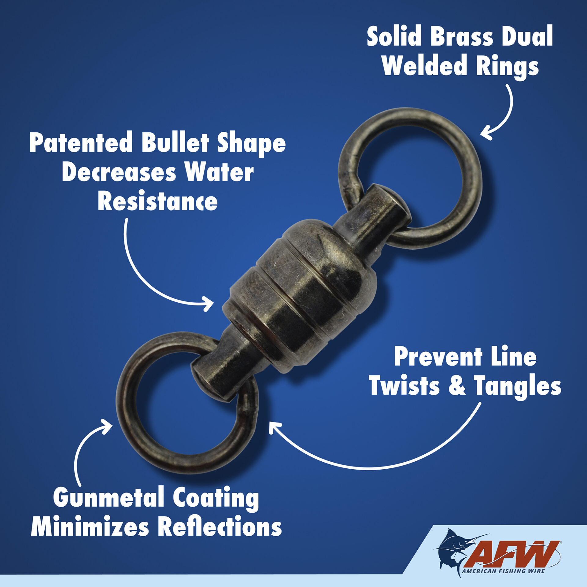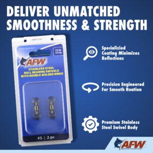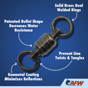 These dual-rotation solid Stainless Steel Ball Bearing Swivels are engineered to survive the fiercest one-on-one battles. The patented bullet shape provides fluid rotation and decreased water resistance. The unique gun metal black finish minimizes reflections and cloaks the tackle. Swivels have a solid stainless steel body, stainless steel bearings, and double-welded rings for maximum security and to endure the unforgiving offshore environment. Don’t even think about making a trip to the canyon, or out of sight of the shoreline, without these battle-tested ball bearing swivels in your tackle box. Patented D549,750 S.